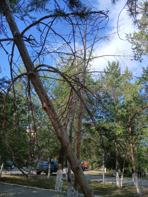 Ещё один запущенный сквер находится между Городским ДК и школой №16. Весной этого года там подсаживали новые деревца. При посадке их полили и забыли. Сколько из посаженных осталось живых, никто не знает. А из существующих насаждений добрая половина сухостой. О вырезке сушняка я говорил на встречах акимом Астанинского района. Но время идёт, а чистка сквера не проводится. На чистку больших миллионов не нужно. Полив деревьев также не организован должным образом. Деревья ждут влаги, а её нет ни с верху, ни снизу. Вот и вызывает опасения, что новые скверы со временем будут такими же.