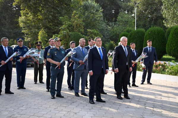 Казахстанская делегация во главе с Муратом Нуртлеу возложила венок к монументу воинам-казахстанцам, павшим 7 апреля 1995 года при исполнении воинского долга по охране внешних границ СНГ на таджикско-афганском участке.