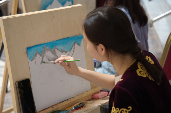 Талгат действительно сделал это с блеском, иностранные гости были изумлены таким приятным бонусом - шли в музей, а попали на концерт! А для вдохновения артистов юные художники расположили в фойе свои мольберты и рисовали на глазах у зрителей.