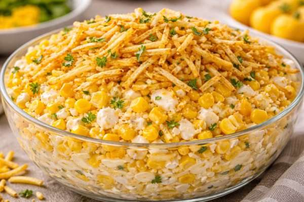 Перед подачей выложите салат в салатник и сверху щедро посыпьте тонкой хрустящей картошкой фри. Она добавляет приятную текстуру и делает салат ещё вкуснее. При желании можно украсить тертым желтком — получится настоящий «желтый одуванчик».