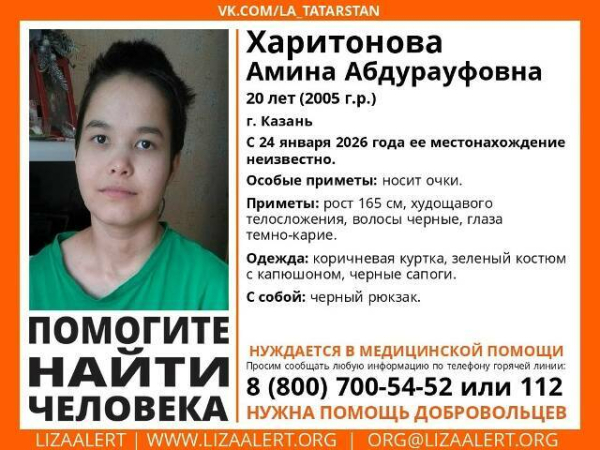 В Казани волонтёры разыскивают 20-летнюю Амину Харитонову. Девушка бесследно пропала 24 января. Об этом сообщили в поисково-спасательном отряде «ЛизаАлерт».