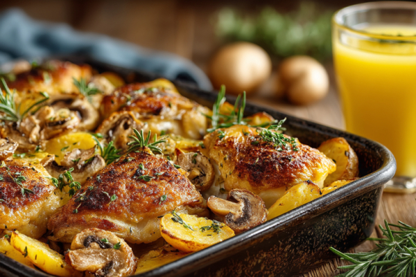 Рецепт: курицу натрите солью, перцем и паприкой. Картофель нарежьте крупными дольками, грибы — четвертинками, лук — полукольцами. В глубоком противне смешайте картофель, грибы и лук, посолите, поперчите, сбрызните маслом. Сверху выложите курицу. В отдельной миске смешайте ананасовый сок и соевый соус, равномерно полейте этой смесью все содержимое противня. Накройте фольгой и запекайте в разогретой до 190 °C духовке 40 минут. Затем снимите фольгу и запекайте ещё 20–25 минут до румяной куриной корочки. Подавайте сразу, поливая соком из формы.
