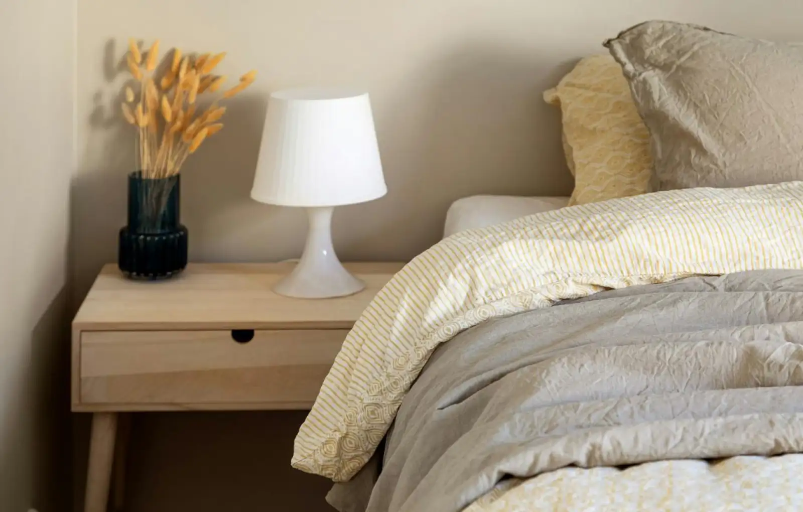 - Основание светильника по ширине должно быть меньше, чем столешница прикроватной тумбы.