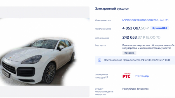 На электронные торги выставили автомобиль Porsche Cayenne за 4,85 миллиона рублей. Аукцион открыли на государственном портале Torgi.gov.ru. В качестве местонахождения автомобиля указана Республика Татарстан, город Бугульма.