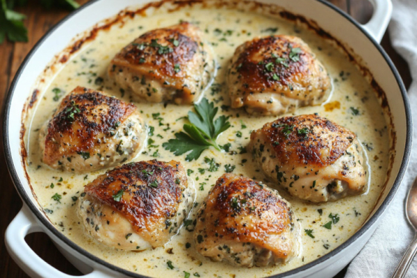 Для приготовления вам понадобится: 6–8 куриных бедер (можно с костью и кожей), 500 мл сливок — 20%, 1 крупная луковица, 1 головка чеснока (не меньше 6–8 зубчиков), небольшой пучок кинзы, соль, чёрный перец и хмели-сунели по вкусу. Лук нарежьте тонкими полукольцами, чеснок измельчите, кинзу мелко порубите. В форме для запекания смешайте сливки с половиной чеснока, солью, перцем и хмели-сунели. Выложите куриные бедра в сливочную смесь кожей вверх, посыпьте луком, оставшимся чесноком и зеленью. Накройте фольгой и запекайте при 190 градусах 40 минут, затем снимите фольгу и готовьте ещё 15–20 минут до румяной корочки. Дайте постоять 10 минут и подавайте с лавашом или отварным рисом, полив ароматным соусом.