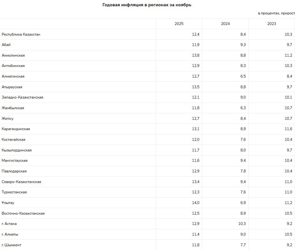 По данным Бюро национальной статистики АСПиР РК, средний уровень инфляции по республике на 1 декабря 2025 года составил 12,4 % — на 4 процентных пункта выше, чем в прошлом году.