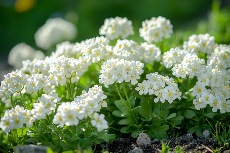 Иберис зонтичный — настоящее спасение для тех, кто мечтает о красивом саде без постоянных хлопот. Его нежные соцветия, собранные в плотные зонтики, напоминают россыпь мелкого жемчуга, укрывшую зелёный ковер листвы. Высота растения достигает 25–35 см, а во время цветения кустики полностью скрываются под белоснежными, нежно-розовыми или сиреневыми шапками. Цветение начинается в июне и продолжается до августа, особенно если вовремя удалять увядшие соцветия.