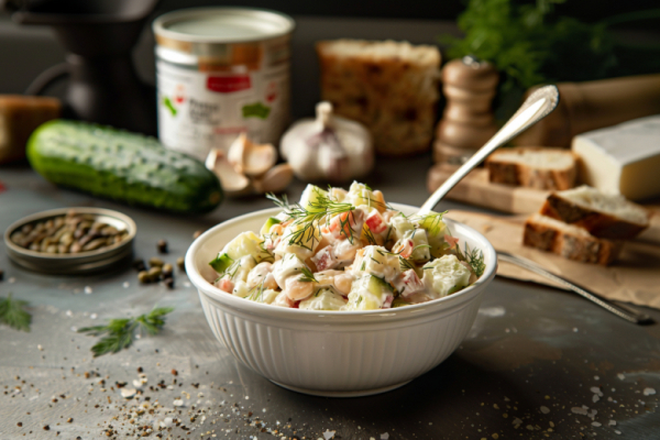 Когда нет времени готовить, а хочется чего-то сытного и вкусного, этот салат выручает на все сто. Никакой варки — только нарезка и смешивание. Главная фишка — хрустящие сухарики, которые делают блюдо особенно аппетитным.