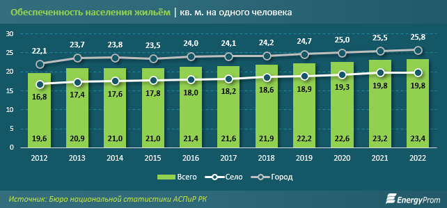 К концу 2022 года обеспеченность жильем на одного проживающего в РК составила 23,4 квадратных метров — всего на 0,9% больше, чем в предыдущем году. Это значение существенно ниже стандартов ООН — 30 квадратных метров. Именно такой показатель, по мнению Организации Объединенных Наций, является минимально допустимым в развитых странах. Для сравнения: в соседней России уровень обеспеченности жильем составляет уже более 28 квадратных метров на человека, в Великобритании — 35 квадратных метров, во Франции и даже в густонаселённой Японии — 39 квадратных метров, в Германии, чьи проблемы с жильем общеизвестны — 46 квадратных метров, в США — 68 квадратных метров, а в Австралии — и вовсе 89 квадратных метров.
