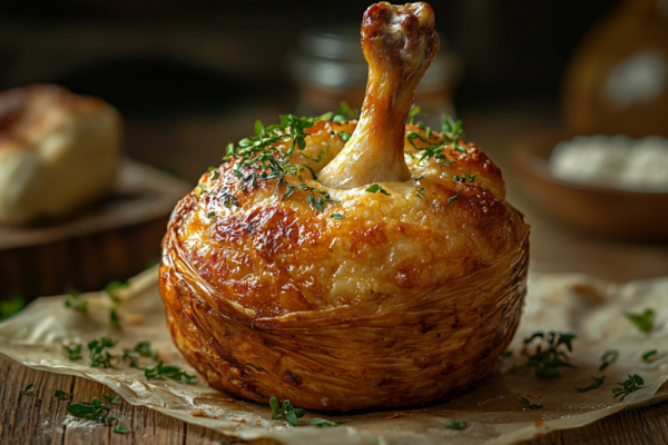 В процессе запекания слоеное тесто равномерно поднимается, образуя вокруг голени золотистую, многослойную и невероятно аппетитную «корочку», которая защищает мясо и сохраняет его сочным.