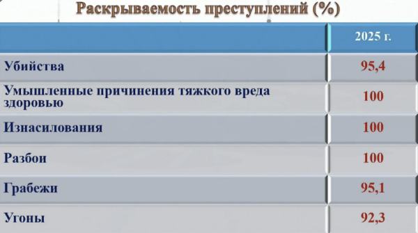 «Свыше 95% находится результативность установления виновных по убийствам. Раскрываемость фактов причинения тяжкого вреда здоровью, изнасилований и разбойных нападений — 100%», — привёл данные министр.