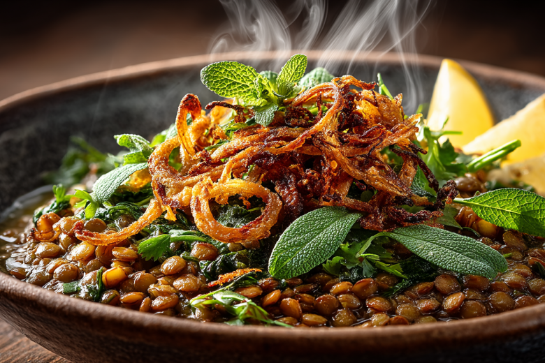 В сковороде разогреваю оставшиеся 2 ложки масла и выкладываю лук. Обжариваю на среднем огне, периодически помешивая, около 10–12 минут, до красивого золотисто-коричневого цвета и хрустящей текстуры. Готовый лук выкладываю на бумажное полотенце, чтобы убрать излишки масла. Кинзу и шалфей промываю, обсушиваю и отделяю листики. Лимон ошпариваю кипятком и нарезаю крупными дольками. Готовую чечевицу выкладываю на сервировочное блюдо, сверху горкой выкладываю хрустящий лук и посыпаю свежей зеленью. Подаю сразу, с дольками лимона, чтобы можно было сбрызнуть блюдо свежим цитрусовым соком по вкусу.