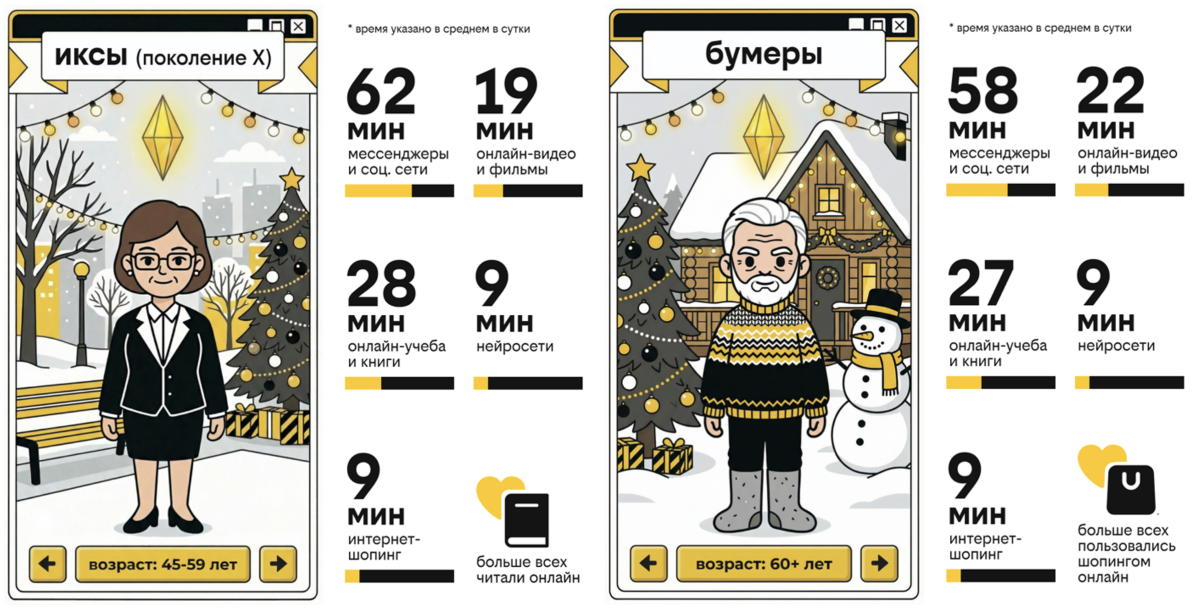 Безусловно, все поколения пользовались разнообразными сервисами – от соцсетей и маркетплейсов до игр и видеосервисов. Самую высокую активность в интернете на новогодних каникулах в Казани показали зумеры. В среднем каждый представитель молодежи проводил в интернете около 5 часов 40 минут в день.